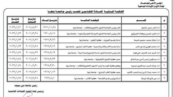 القائمة المبدئية لمرشحي رئاسة جامعة بنها