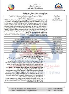 لما جاء بالكتاب الدوري (٥٥) والنشرة التوجيهية الواردة من وزارة التربية والتعليم وذلك وفقا لما تم إرساله من الإدارة المركزية للتعليم العام بالوزارة والإدارة العامة للموهوبين والتعلم الذكي بالوزار للعمل على توفير  الوظائف التالية للعاملين بالتربية والتعليم بالبحيرة