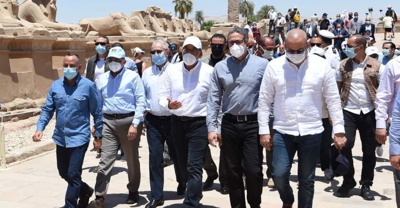 متابعة لما يتم تنفيذه من مشروعات تتعلق بترميم وإعادة إحياء المواقع والمناطق الأثرية والتاريخية على مستوى الجمهورية، قام الدكتور مصطفى مدبولى، رئيس مجلس الوزراء، اليوم يرافقه الدكتور خالد العنانى، وزير السياحة والآثار، واللواء محمود شعراوى، وزير التنمية المحلية، والدكتور عاصم الجزار، وزير الإسكان والمرافق والمجتمعات العمرانية، والمستشار مصطفى ألهم ، محافظ الأقصر، والدكتور مصطفى وزيرى، الأمين العام للمجلس الأعلى للآثار، بتفقد أعمال مشروع ترميم طريق الكباش بالأقصر، وكذا الأعمال الجارية بمعبدى الكرنك والأقصر، استعدادا لاحتفالية الافتتاح.