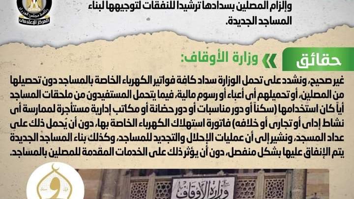 انتشر في بعض المواقع الإلكترونية وصفحات التواصل الاجتماعي أنباء بشأن توقف الحكومة عن سداد فواتير الكهرباء الخاصة بالمساجد وإلزام المصلين بسدادها ترشيداً للنفقات لتوجيهها لبناء المساجد الجديدة، وقد قام المركز الإعلامي لمجلس الوزراء بالتواصل مع وزارة الأوقاف، والتي نفت تلك الأنباء، مُؤكدةً أنه لا صحة لتوقف الحكومة عن سداد فواتير الكهرباء الخاصة بالمساجد وإلزام المصلين بسدادها ترشيداً للنفقات لتوجيهها لبناء المساجد الجديدة، مُشددةً على تحمل الوزارة سداد كافة فواتير الكهرباء الخاصة بالمساجد دون تحصيلها من المصلين، أو تحميلهم أي أعباء أو رسوم مالية، فيما يتحمل المستفيدون من ملحقات المساجد أيًِِِّا كان استخدامها (سكناً أو دور مناسبات أو دور حضانة أو مكاتب إدارية مستأجرة لممارسة أي نشاط إداري أو تجاري أو خلافه) فاتورة استهلاك الكهرباء الخاصة بها، دون أن يُحمل ذلك على عداد المسجد، مُشيرةً إلى أن عمليات الإحلال والتجديد للمساجد، وكذلك بناء المساجد الجديدة يتم الإنفاق عليها بشكل منفصل، دون أن يؤثر ذلك على الخدمات المقدمة للمصلين بالمساجد.