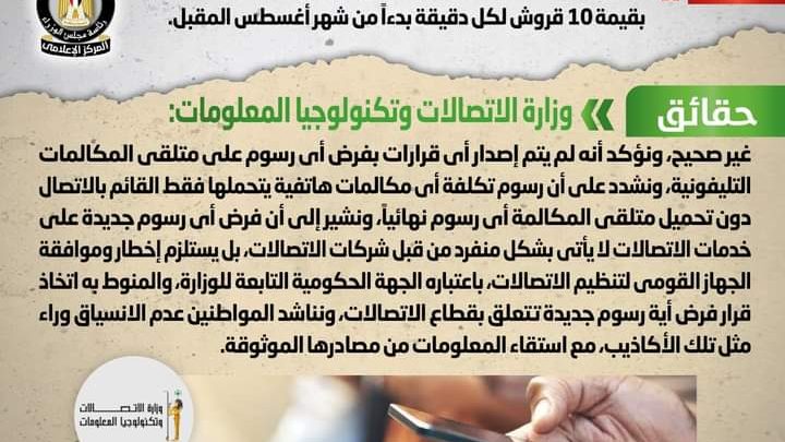تداولت بعض المواقع الإلكترونية وصفحات التواصل الاجتماعي أنباء بشأن فرض شركات الاتصالات رسوماً على متلقي المكالمة التليفونية بقيمة 10 قروش لكل دقيقة بدءاً من شهر أغسطس المقبل، وقد قام المركز الإعلامي لمجلس الوزراء بالتواصل مع وزارة الاتصالات وتكنولوجيا المعلومات، والتي نفت تلك الأنباء، مُؤكدةً أنه لا صحة لفرض شركات الاتصالات رسوماً على متلقي المكالمة التليفونية بقيمة 10 قروش لكل دقيقة بدءاً من شهر أغسطس المقبل، وأنه لم يتم إصدار أي قرارات بفرض أي رسوم على متلقي المكالمات التليفونية، مُشددةً على أن رسوم تكلفة أي مكالمات هاتفية يتحملها فقط القائم بالاتصال دون تحميل متلقي المكالمة أي رسوم نهائياً، مُشيرةً إلى أن فرض أي رسوم جديدة على خدمات الاتصالات لا يأتي بشكل منفرد من قبل شركات الاتصالات، بل يستلزم إخطار وموافقة الجهاز القومي لتنظيم الاتصالات باعتباره الجهة الحكومية التابعة للوزارة، والمنوط به اتخاذ قرار فرض أية رسوم جديدة تتعلق بقطاع الاتصالات، مُناشدةً المواطنين عدم الانسياق وراء مثل تلك الأكاذيب، مع استقاء المعلومات من مصادرها الموثوقة.