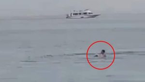 فيما يمكن رؤيته وهو يحاول يائساً السباحة باتجاه الشاطئ، ولكن يبدو أنه يتعرض للهجوم من قبل سمكة القرش بينما لا يزال في المياه العميقة.