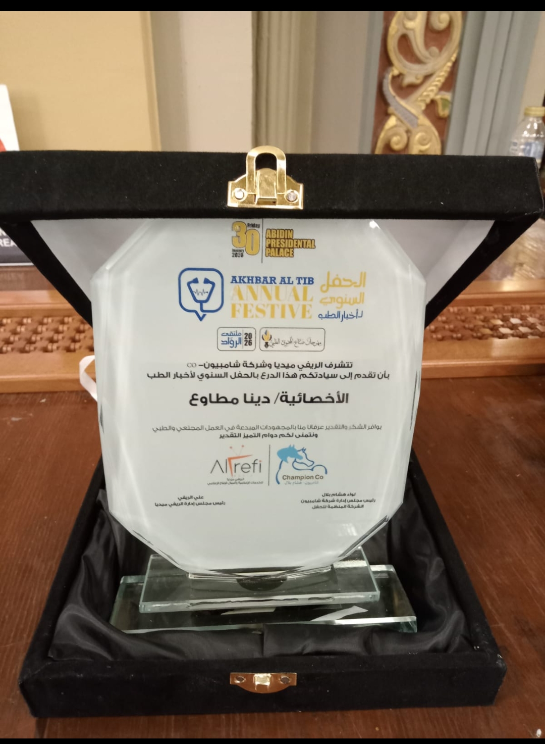 كتبت أمانى موسى يأتي الحفل بمشاركة ورعاية رئاسة الجمهوريه ،وعدد من الوزراء، وحضور كوكبة من أبرز العلماء والأطباء ورواد القطاع الصحي والشخصيات العامة المصرية، حيث تم تكريم عدد من الأسماء البارزة والمؤثرة بالقطاعين الطبي والدوائي في مصر. ا. دينا مطاوعحاصله دبلومه تخاطب...
