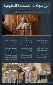 ونفّذ 176 فريقًا تطوعيًا بالمسجد النبوي والساحات التابعة له أكثر من 198 فرصة تطوعية مساندة في مختلف التخصصات، تضمنت تقديم الخدمات للأشخاص ذوي الإعاقة، وخدمة الإرشاد المكاني، وخدمة العيادات الطبية، ومبادرة الابن البار لخدمة كبار السن، وتوزيع وجبات الإفطار، وخدمة النقل الترددي، وتنظيم الحشود البشرية، والخدمات الإسعافية، وتوزيع المظلات للوقاية من حرارة الشمس هديةً لقاصدي المسجد النبوي، قام بها أكثر من 16 ألف متطوع ومتطوعة، بإشراف ومتابعة من الهيئة العامة للعناية بشؤون المسجد الحرام والمسجدالنبوي.