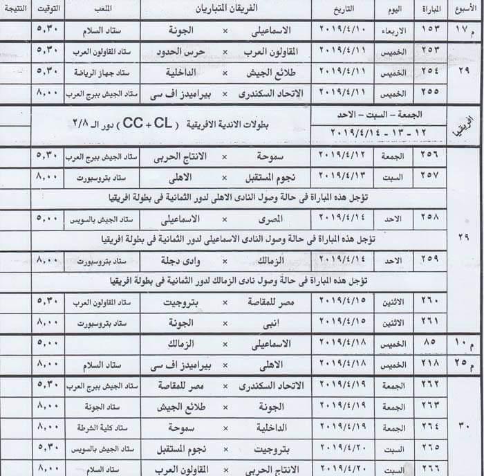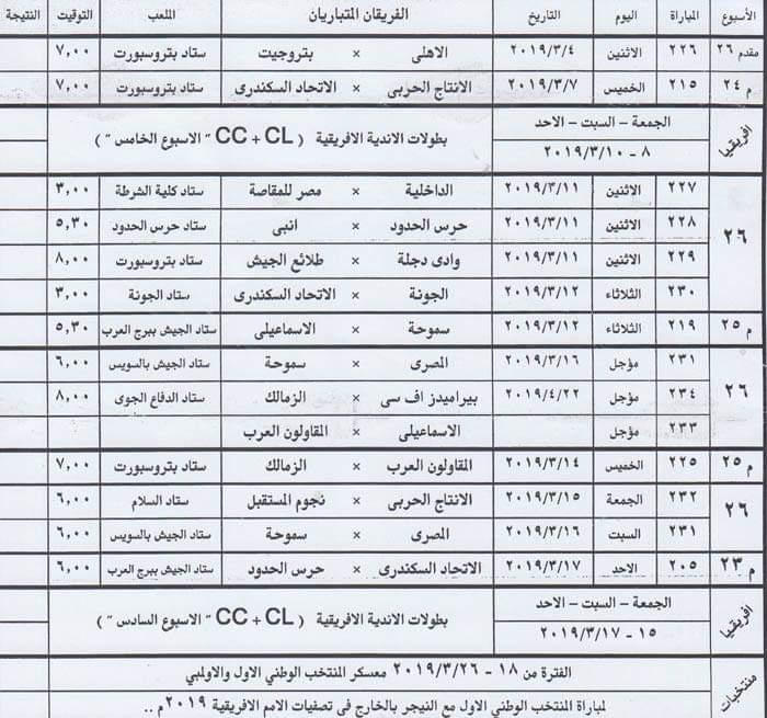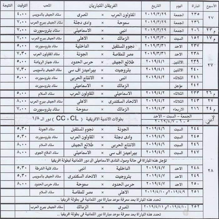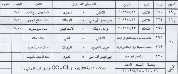 أعلنت لجنة المسابقات بالاتحاد المصرى لكرة القدم جدول مباريات الدورى العام لأندية القسم الأول، من الأسبوع 26 وحتى الأسبوع 30، ويتضمن تغيير بعض الملاعب نظرا لاغلاق بعض الاستادات بمناسبة استضافة مصر لبطولة الأمم الإفريقية 2019، وذلك على النحو التالى: