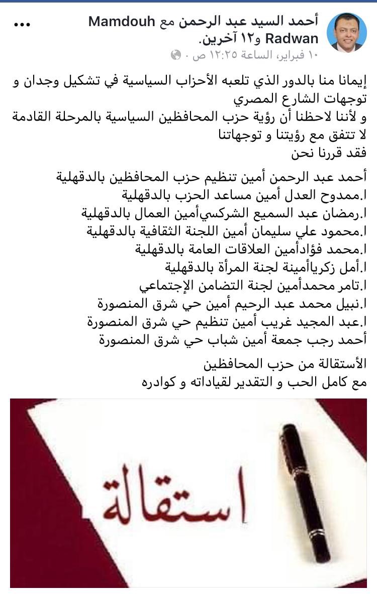 وقال قيادات الأمانة في بيان تداولته صفحات الحزب بالفيس بوك: "إيمانا منا بالدور الذى تلعبه الأحزاب السياسية فى تشكيل وجدان وتوجهات الشارع المصرى، ولأننا لاحظنا أن رؤية حزب المحافظين السياسية بالمرحلة القادمة لا تتفق مع رؤيتنا و توجهاتنا، فقد قررنا نحن أحمد عبد الرحمن أمين تنظيم حزب المحافظين بالدقهلية ،و ممدوح العدل أمين مساعد الحزب بالدقهلية ،وًرمضان عبد السميع الشركسي أمين العمال بالدقهلية ،ومحمود علي سليمان أمين اللجنة الثقافية بالدقهلية ،و محمد فؤاد أمين العلاقات العامة بالدقهلية ،و أمل زكريا أمينة لجنة المرأة بالدقهلية ،و تامر محمد أمين لجنة التضامن الإجتماعي ،و نبيل محمد عبد الرحيم أمين حي شرق المنصورة ،و عبد المجيد غريب أمين تنظيم حي شرق المنصورة ،و أحمد رجب جمعة أمين شباب حي شرق المنصورة الاستقالة من حزب المحافظين مع كامل الحب و التقدير لقياداته و كوادره.