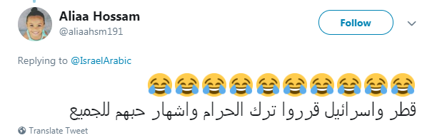 إحدى المتابعات سخرت من الخبر قائلة "قطر وإسرائيل قررا ترك الحرام وإشهار حبهم للجميع" بينما قال آخر سعودى "نبارك لقطرئيل هذا الانجاز ونعزى الشعب القطرى" .
