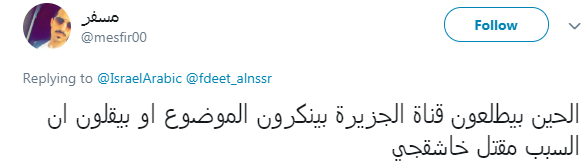 وقال ثالث " الحين بيطلعون قناة الجزيرة بينكرون الموضوع او بيقلون ان السبب مقتل خاشقجي"، وقال مغرد أخر معلقا على الخبر " مبروك قطر إنجاز عظيم للأمة والشعوب الإسلامية زيارة مسؤول قطر لإسرائيل قبل أشهر كانت من اجل ترخيص لمطاعم إسرائيل بالجزيرة العربية حسبنا الله ونعم الوكيل"