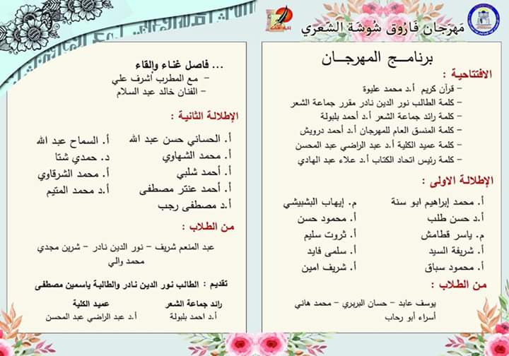 يشارك في المهرجان نخبة من كبار شعراء مصر والفاعلية تأتي في إطار أنشطة الكلية وجماعة الشعر، ويشرف على المهرجان الأستاذ الدكتور أحمد درويش ويقوم بتقديم الاحتفالية الشاعر الدكتور أحمد بلبولة رائد جماعة الشعر بجانب الاشراف والتنسيق والتقديم مع نور الدين نادر مقرر الجماعة -