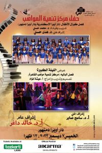 تواصل دار الأوبرا المصرية برئاسة الدكتور خالد داغر عروض مركز تنمية المواهب على مسرح أوبرا دمنهور وذلك فى العاشرة صباح يوم الخميس الموافق 7 ديسمبر إشراف فنى الدكتورة هدى حسني.