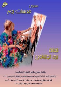 همسات الروح يقام بقاعة صلاح طاهر للفنون التشكيليةالخميس الموافق 29 ديسمبر من الشهر الجاري في السابعة مساء وتحت رعاية الدكتور مجدي صابر رئيس دار الأوبرا المصرية والفنان أيمن صلاح طاهر..