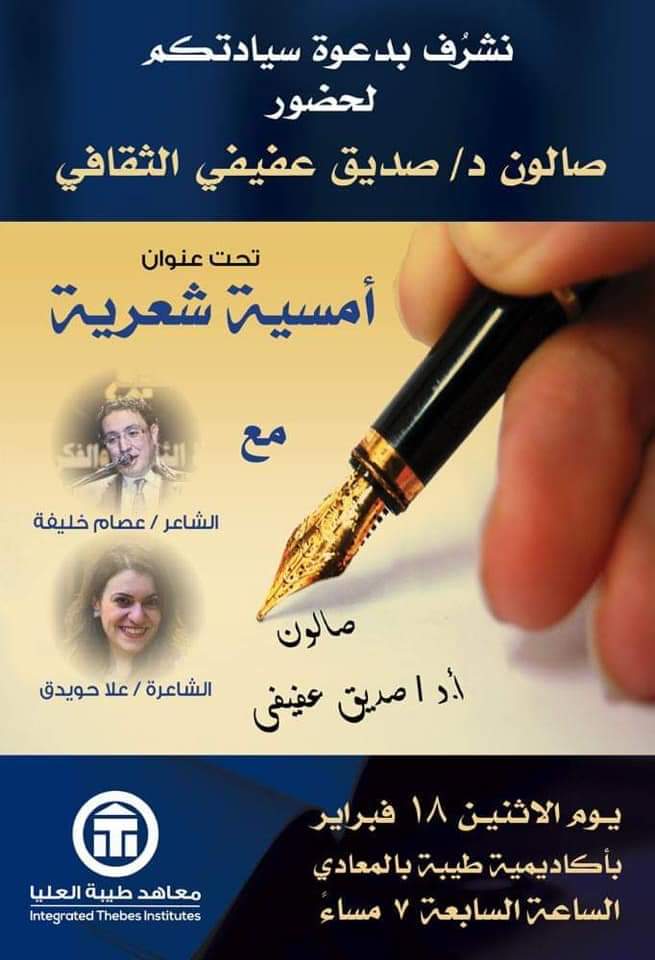 ويستضيف الصالون اثنين من أبرز شعراء مصر والعالم العربي وهو الدكتور عصام خليفة الملقب بأميرشعراء العرب عام 2016.