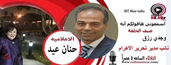 يستضيف برنامج" اسمعوني هاقولكم أيه" والذي تقدمه الاعلامية المتألقة حنان عيد يستضيف الكاتب الصحفي وجدي رزق نائب مدير تحرير جريدة الأهرام وذلك يوم الثلاثاء القادم في الساعة الثالثة عصرا.