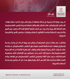 وأكدت علي أن قرارات الشرعية الدولية والمواقف العمانية الثابتة تجاه القضية الفلسطينية والداعية إلي إنسحاب إسرائيل من الأراضى الفلسطينية المحتلة الي حدود 1967وتمكين الشعب الفلسطيني من إقامة دولته المستقلة وعاصمتها القدس الشرقية وفق مبدأ حل الدولتين ومبادرة السلام العربية