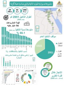 وأوضح سيادته أنه تم ويجرى تأهيل ترع بأطوال إجمالية ٤٤٦٦ كيلومتر بمراكز حياه كريمة ، حيث بلغت أطوال الترع التى تم نهو تأهيلها حوالى ٢٩٥١ كيلومتر ، وجارى العمل في ترع بأطوال تصل إلى ١٥١٥ كيلومتر ، كما يجرى تنفيذ عدد (٤) عمليات للحماية من أخطار السيول بمحافظة الجيزة ، تشتمل على إنشاء بحيرات وحواجز وسدود إعاقة وأحواض تهدئة.