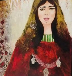 و قد استعملت في رسم اللوحات تقنيات مختلفة: الالوان الزيتية، تقنية اللصق وتقنية السكين و عدة خامات لتُعبّر بها علي قوّة المرأة من نضال و حكمة و دهاء هذا هو هدفها في مجال الفن و التشكيل…..!