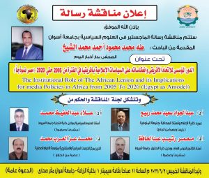 خاص..صوت الوطن ناقشت جامعة أسوان بمقر صحاري، رسالة الماجستير في العلوم السياسية للباحث الصحفي طه محمد محمود أحمد محمد الشيخ - بدار أخبار اليوم - بعنوان " الدور المؤسسي للاتحاد الأفريقي وانعكاساته علي السياسات الإعلامية بأفريقيا في الفترة من 2005 حتى 2020(مصر نموذجا)، تحت إشراف د