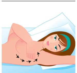 - عند اكتمال الدائرة تحركي قليلًا نحو الحلمة واستكملي دائرة أخرى، استمري هكذا حتى تتحسسي الثدي بأكمله وتأكدي من تحسس المناطق الخارجية العليا التي تمتد إلى الإبط.