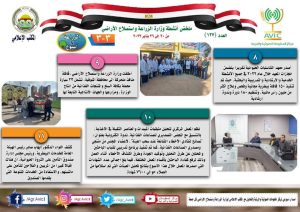 أصدر مركز المعلومات الصوتية والمرئية، التابع لوزارة الزراعة واستصلاح الأراضي، "الانفوجراف الأسبوعي" في نسخته رقم ١٢٧ ، حول الحصاد الأسبوعي لأهم أنشطة الوزارة، خلال الأسبوع الماضي في الفترة من ٢٠ إلى ٢٦ يناير الجاري، وذلك بالتعاون مع المكتب الإعلامي للوزارة، كما أصدر المركز أيضا ملخصا بالفيديو، حول أنشطة الوزارة خلال نفس الفترة.