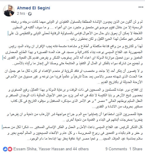 وأضاف "السجيني"، "لهذا و للتاريخ و من واقع قناعة مكتملة وإطلاع ومشاهدة متسعة فانه يجب الإقرار ان وفاء السيد رئيس الجمهورية عبد الفتاح السيسى بوعده ببناء كاتدرائية ومسجد فى هذه المدة القصيرة و بهذا الطابع المعمارى المتميز و دون تحميل موازنة الدولة اى اعباء أنه لأمر يستوجب الشكر و يفرض تقدبم كل التحية و التقدير له و لجميع من شارك سواء بالفكر او المال أو التنفيذ و المتابعة حتى وصلنا الى إنجاز ما رأيناه بالأمس"..