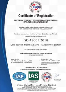حيث إجتازت الشركة المصرية لإدارة وتشغيل مترو الأنفاق بإشراف المهندس على الفضالي رئيس مجلس الإدارة والعضو المنتدب للدعم الفني و المهندس خالد صبره العضو المنتدب للتشغيل والصيانة أعمال المراجعة الخارجية على نظامي السلامة والجودة للتوافق مع متطلبات نظامي الأيزو الدوليين ٢٠١٥:٩٠٠١ الخاص بإدارة الجودة و ٢٠١٨:٤٥٠٠١ الخاص بإدارة السلامة والصحة المهنية لورش طره البلد لصيانة الوحدات المتحركة العاملة بالخط الأول حلوان - المرج الجديدة .
