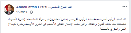 وقالت صفحة الرئيس السيسى على "فيس بوك": "قام السيد الرئيس أمس باصطحاب الرئيس الفرنسي إيمانويل ماكرون في جولة بالعاصمة الإدارية الجديدة، تضمنت تفقد مدينة الفنون والثقافة، والتي ستعد الإنجاز الثقافى الأضخم فى الشرق الأوسط ومنارة للإبداع الفني والفكري بالمنطقة".