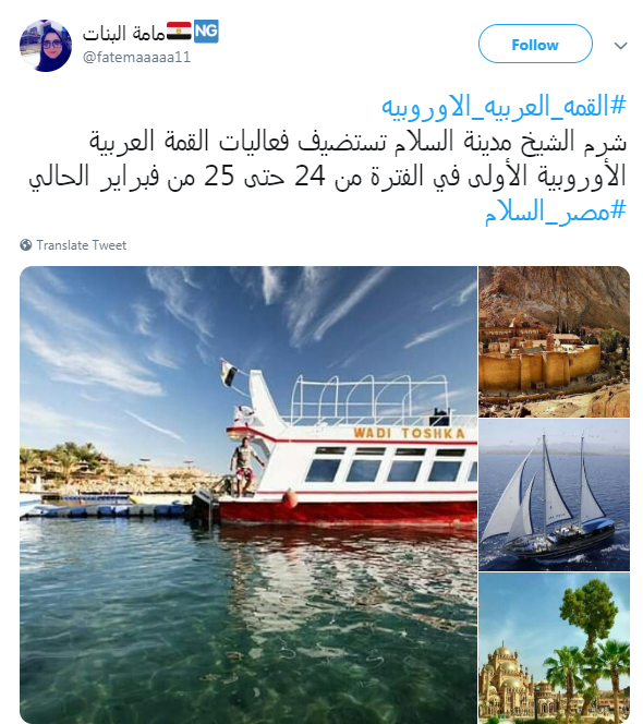 تستضيف مدينة شرم الشيخ السياحية، فعاليات القمة العربية الأوروبية الأولى في الفترة من 24 حتى 25 من فبراير الجاري، بمشاركة 50 دولة عربية وأوروبية، وفى إطار الاحتفاء بانطلاق القمة العربية الأوروبية، تصدر هاشتاج #القمة_العربية_الاوروبية، الأكثر تداولا فى مصر على "تويتر"، خلال الساعات