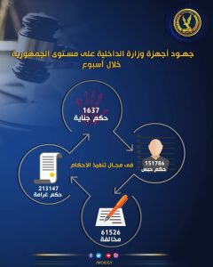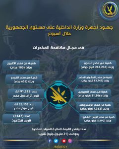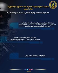 واصلت أجهزة وزارة الداخلية على مستوى الجمهورية توجيه الحملات الأمنية بالتنسيق مع قطاع الأمن المركزى.. حيث أسفرت جهود أجهزة وزارة الداخلية خلال أسبوع.. عن تحقيق النتائج الإيجابية التالية: