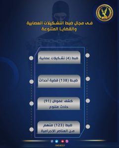 كشف غموض (91) حادث متنوع ، أبرزهم (قتل ، سرقة بالإكراه ، حريق عمد، إنتحال صفة) وتم ضبط مرتكبيها بإجمالى (123) متهماً.