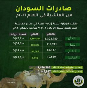 وأن زيادة الصادرات بلغت نسبة 30.8% مقارنة بالعام الماضي من جملة صادر الماشية الحية من (الإبل، والضأن، الأبقار، الماعز)، وأشار إلى أنها قدرت بنحو (2) مليون رأس، مقارنة بالعام 2020م الذي بلغ صادر الماشية الحية خلال هذا العام (1.475.319) رأس من الصادر الحي وان الصادر اللحوم سجل أيضاً ارتفاعاً كبيراً وحقق زيادة بنسبة بلغت 82.2% مقارنة بالعام 2020م.