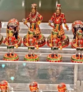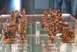 كتب :بسنت عبد الحميد شَطرنج من الذَهب الخَالص المُرصع بالمَاس والأحجَار الكَريمه المُلونه من مُقتنيات (الملك فاروق) ويَعد من أغلَي الهَدايا في العَالم التي تَم تَقديمها وقتَها وتحمل طِراز هِندي في شَكله ومضمُونه وهو مُحاكاه لحَرب بين فَريقين باللون الأحمَر والأخضَر بع