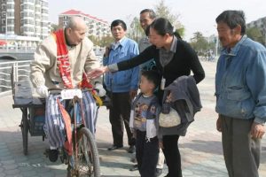 بعد ذلك، قرر العمل لدعم الطلاب الفقراء، وكسب الأموال عن طريق نقل البضائع على دراجة ثلاثية العجلات وواصل ركوب دراجة ثلاثية العجلات لمدة 15 عاما. كان يأكل اثنين من الكعك على البخار ويشرب زجاجة من الماء لوجبة واحدة، وفر بضعة يوانات في يوم ووفر 250 ألف يوان وتبرع بها كلها لمساعدة نحو 300 من الطلاب الفقراء بهدف تعليمهم.