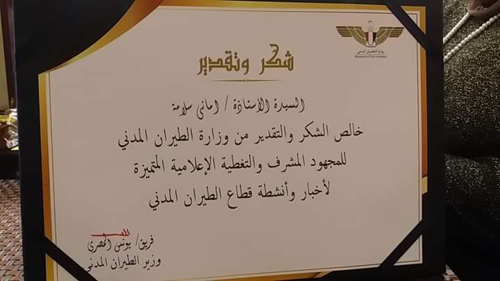 قام وزير الطيران الفريق يونس المصري بتكريم الكاتبة الصحفية أماني سلامة نائب رئيس تحرير الوفد وذلك في إحتفالية وزارة الطيران التي أقيمت مؤخرا وتم اختيار أماني سلامة الأم المثالية لهذا العام..