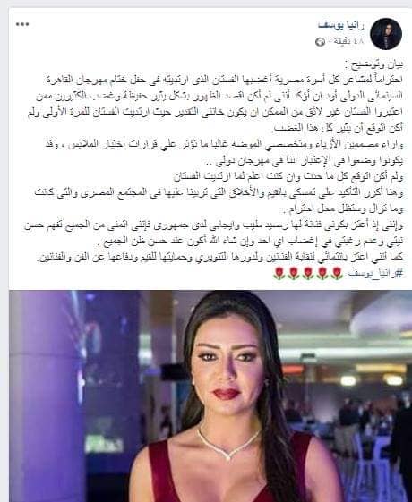 نشرت الفنانة رانيا يوسف، ردًا على حسابها الخاص بموقع التواصل الاجتماعي فيس بوك، على ما أثير مؤخرًا من هجوم حاد عبر صفحات السوشيال ميديا، بخصوص ارتدائها فستان مثير بحفل ختام مهرجان القاهرة السينمائي اعتبره البعض "فاضحًا".