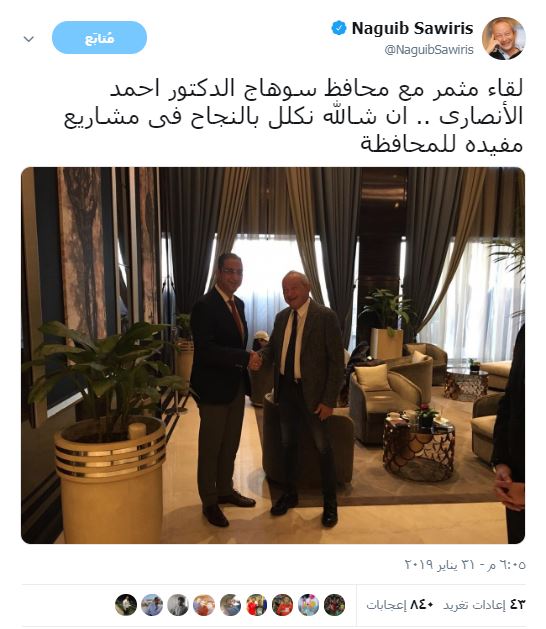 ونشررجل الأعمال نجيب ساويرس، صورته برفقة الدكتور أحمد الأنصارى، محافظ سوهاج، قائلاً:"لقاء مثمر مع محافظ سوهاج الدكتور أحمد الأنصارى .. إن شاء لله نكلل بالنجاح فى مشاريع مفيدة للمحافظة".