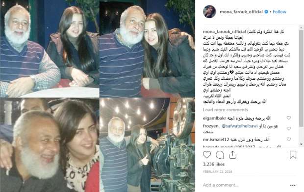 حرصت منى فاروق على توجيه كلمات إلى والدها الراحل طوال الوقت عبر حسابها الرسمي على "إنستجرام"، ما بين عيد مولده وذكرى وفاته، الأعياد، بالإضافة إلى المواقف الصعبة التي تمر بها، وتقوم بنشر صور خاصة به وأخرى تجمعهما معا.