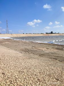و جاري أعمال العزل بخلية رقم ٢ بطبقة أولية من جيوتكستايل بسمك ٣٥٠ جرام لكل متر ثم طبقة بولي إيثيلين عالي الكثافة ثم طبقة أخيرة من جيوتكستايل بسمك ١٠٠٠ جرام لكل متر وجاري فرد طبقة القاع والميول للخلية رقم ٣ وتم إنشاء بحيرة التبخر لتجميع سائل الرشيح