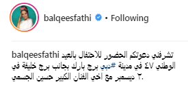 . وكتبت بلقيس عبر حسابها على "إنستجرام"، قائلة: "تشرفني دعوتكم الحضور للاحتفال بالعيد الوطني ٤٧ في مدينة دبي برج بارك بجانب برج خليفة في ٢ ديسمبر مع اخي الفنان الكبير حسين الجسمي".