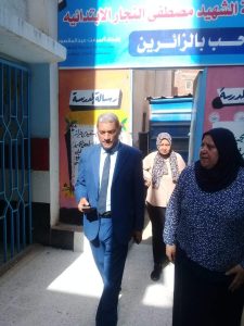حيث تفقد جوانب وفصول المدرسة واثنى بالشكر لهيئة التدريس ومديرة المدرسة مرفت عبد المقصود لما وضعته من لمسات لتزيين أركان المدرسة لاستقبال العام الدراسى الجديد
