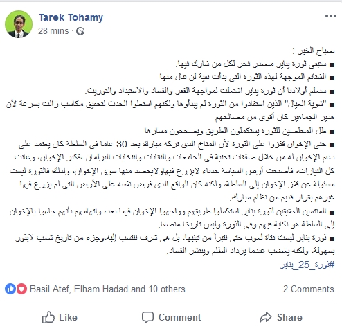 دون الكاتب الصحفي، طارق تهامي، سكرتير مساعد حزب الوفد، عبر حسابه الشخصي على موقع التواصل الاجتماعي "فيس بوك"، كلمات في الذكرى الثامنة لثورة 25 يناير، قال فيها: "صباح الخير: ستبقى ثورة يناير مصدر فخر لكل من شارك فيها، والشتائم الموجهة لهذه الثورة التي بدأت نقية لن تنال منها".
