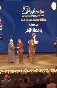 وقد كرم الدكتور مصطفى مدبولي، رئيس مجلس الوزراء، فضيلة الأستاذ الدكتور سلامة داود، رئيس الجامعة، وحضور الدكتور محمد فكري خضر، نائب رئيس الجامعة لفرع البنات، خلال احتفالية توزيع جوائز: «مصر للتميز الحكومي» في دورتها الثالثة، والتي تم تنظيمها برعاية فخامة السيد الرئيس عبد الفتاح السيسي، رئيس الجمهورية؛ لحصولها على المركز الثالث في جائزة مصر لتكافؤ الفرص وتمكين المرأة، والتي تقدمت جامعة الأزهر لها بإشراف الدكتور محمد فكري خضر، نائب رئيس الجامعة لفرع البنات.