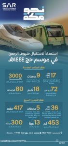 أعلنت الخطوط الحديدية السعودية " سار"، عن جاهزية قطار "الحرمين السريع" وقطار “المشاعر المقدسة" لنقل ضيوف الرحمن خلال موسم حج هذا العام 1444هـ، بكل سهولة ويسر؛ حيث تم تسخير كافة الإمكانيات للإسهام في تحسين تجربة الحاج عبر تنقله السلس في قطار الحرمين السريع الذي يعتبر أحد أسرع عشرة قطارات في العالم، حيث يربط الحرمين الشريفين ببعضهما مرورًا بمدينة الملك عبدالله الاقتصادية ومدينة جدة.