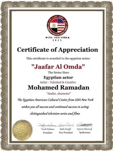 منذ ساعات حصل النجم محمد رمضان على شهاده تقدير من المركز الثقافي المصري الامريكي بولايه نيويورك عن دوره في مسلسل جعفر العمده