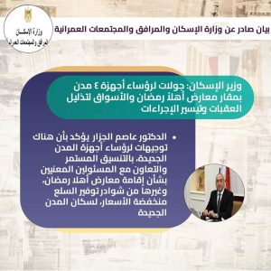 كتب/علاء دياب صرح الدكتور عاصم الجزار، وزير الإسكان والمرافق والمجتمعات العمرانية، بأن هناك توجيهات لرؤساء أجهزة المدن الجديدة، بالتنسيق المستمر والتعاون مع المسئولين المعنيين بشأن إقامة معارض أهلا رمضان، وغيرها من شوادر توفير السلع منخفضة الأسعار