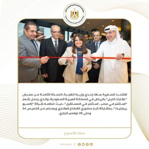 14) افتتحت السفيرة سها جندي وزيرة الهجرة، النسخة الثامنة من معرض "عقارات النيل" بالرياض في المملكة العربية السعودية، والذي يحمل شعار "استثمر في مصر.. استثمر في المستقبل"، حيث تنظمه شركة "إكسبو ريبابليك"، بمشاركة كبار مطوري القطاع العقاري ويستمر من الخميس 24 وحتى 26 نوفمبر الجاري.