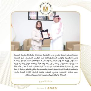 11) خلال أول فعالياتها بالمملكة العربية السعودية.. السفيرة سها جندي وزيرة الهجرة، تلتقي سعادة الوزير أحمد بن سليمان الراجحي، وزير الموارد البشرية والتنمية الاجتماعية السعودي، وذلك في ثاني أيام جولتها الخارجية الأولى، والتي جاءت إلى المملكة العربية السعودية، لاستعراض سبل تطوير أوضاع المصريين المقيمين في المملكة وأي تحديات يواجهونها في العمل أو الإقامة، ووجهت الوزيرة الدعوة إلى السيد وزير الموارد البشرية والتنمية الاجتماعية السعودي لزيارة مصر وتفقد مراكز التدريب والتأهيل بها بما في ذلك المركز المصري الألماني التابع لوزارة الهجرة والذي يُعنى بتأهيل العمالة للتوظيف بسوق العمل، والتنسيق بشأن وضع برامج تدريبية للعمالة المصرية المطلوبة في سوق العمل السعودي.