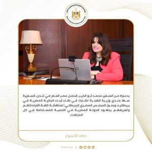1) بدعوة من السفير محمد أبو الخير، قنصل مصر العام في لندن، السفيرة سها جندي وزيرة الهجرة تشارك في لقاء أبناء الجالية المصرية في بريطانيا، ورموز المجلس المصري البريطاني؛ لمناقشة كافة اقتراحاتهم وتعريفهم بجهود الدولة المصرية في التنمية المستدامة في كل المجالات.