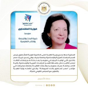 3) السفيرة سها جندي وزيرة الهجرة تنعى الدكتورة فوزية العشماوي رئيس قسم الدراسات العربية والإسلامية بجامعة جنيف، وهي إحدى خبيرات مصر بالخارج، التي توفيت اليوم في سويسرا، بعد رحلة علم وعطاء، أضافت لمصر الكثير خلال رئاستها لقسم الدراسات العربية والإسلامية بكلية الآداب بجامعة جنيف بسويسرا، وشاركت الفقيدة بعلمها وخبرتها في مؤتمر "مصر تستطيع بالتاء المربوطة"، والذي نظمته وزارة الهجرة بالتعاون مع المجلس القومي للمرأة.