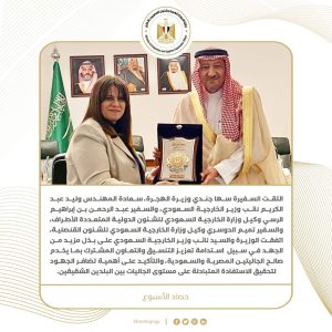 13) التقت السفيرة سها جندي وزيرة الهجرة، سعادة المهندس وليد عبد الكريم نائب وزير الخارجية السعودي، والسفير عبد الرحمن بن إبراهيم الرسي وكيل وزارة الخارجية السعودي للشئون الدولية المتعددة الأطراف، والسفير تميم الدوسري وكيل وزارة الخارجية السعودي للشئون القنصلية، اتفقت الوزيرة والسيد نائب وزير الخارجية السعودي على بذل مزيد من الجهد في سبيل استدامة تعزيز التنسيق والتعاون المشترك بما يخدم صالح الجاليتين المصرية والسعودية، والتأكيد على أهمية تضافر الجهود لتحقيق الاستفادة المتبادلة على مستوى الجاليات بين البلدين الشقيقين.