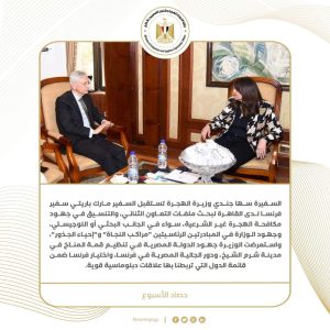 8) السفيرة سها جندي وزيرة الهجرة تستقبل السفير مارك باريتي سفير فرنسا لدى القاهرة لبحث ملفات التعاون الثنائي، والتنسيق في جهود مكافحة الهجرة غير الشرعية، سواء في الجانب البحثي أو اللوجيستي، وجهود الوزارة في المبادرتين الرئاسيتين "مراكب النجاة" و"إحياء الجذور"، واستعرضت الوزيرة جهود الدولة المصرية في تنظيم قمة المناخ في مدينة شرم الشيخ، ودور الجالية المصرية في فرنسا، واختيار فرنسا ضمن قائمة الدول التي تربطنا بها علاقات دبلوماسية قوية.